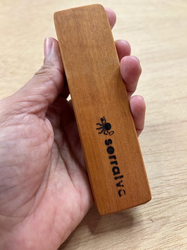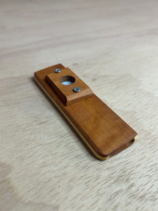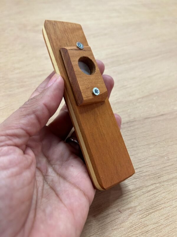 - 1 kazoo artesanal confeccionado pelo próprio Marcelo Serralva, com madeiras nobres. Com parte superior removível (parafuso) para troca do plástico quando precisar (necessita chave philips, não inclusa).